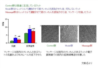 24匹のラットを無作為に3つのグループ(Control群:普通に生活しているラット、Model群はトレッドミルで運動させて筋けいれんを誘発させた後、何もしないラット、Massage群はトレッドミルで運動させて筋けいれんを誘発させた後、マッサージを施したラット)に分け実験が行われました。Model群と比較して、Massage群の疼痛の閾値が増加し、筋緊張レベル、乳酸や尿素窒素レベルが低下しました。電子顕微鏡検査により、Massage群の筋原線維はModel群よりも整然と配置されており、Massage群は明確な明暗帯を示し、ミトコンドリアが増加していることが明らかになりました。本研究では、マッサージ介入後、疼痛の閾値が増加し、骨格筋の超微細構造が改善され、マッサージ療法が筋線維を再配置し、微小循環を増加させることにより、筋肉のけいれんや痛みを軽減する可能性があることが実証されました。
