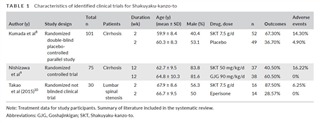 芍薬甘草湯に関しては2020年までに3つのランダム化対照論文が特定されていますが、不均一性が高く、症例数が限られています。Kumadaらは、肝硬変患者において、筋けいれんの頻度に関する改善率 (「著しく改善された」または「改善された」) がプラセボよりも芍薬甘草湯の方が有意に優れていることを報告しました (ウィルコクソン順位和検定、P = .011)。芍薬甘草湯群とプラセボ群を比較した改善のオッズ比は1.27 (95% 信頼区間 [CI]: 0.445-2.086)。Nishizawaらは、肝硬変に関連する痛みを伴う筋肉のけいれんに対する芍薬甘草湯の有効性を牛車腎気丸の有効性と比較しました。どちらも筋肉のけいれんの頻度の改善(「著しく改善」または「改善」)を達成しました。ただし、牛車腎気丸(60.5%) の改善率は、芍薬甘草湯(40.5%) よりも有意に優れていました。(P < 0.05)。芍薬甘草湯群と牛車腎気丸群を比較した改善のオッズ比は-0.81(95%CI、-1.734-0.114)。Takaoらは、腰部脊柱管狭窄症患者における芍薬甘草湯と塩酸エペリゾンの有効性を比較しました。芍薬甘草湯の改善率(87.5%)は、塩酸エペリゾン(28.57%)よりも高かったが、統計分析は行われませんでした。芍薬甘草湯群と塩酸エペリゾン群を比較した改善のオッズ比は2.86(95%CI、0.980‐4.744)でした。3つの研究すべてのオッズ比は統計的有意性を示しませんでした。