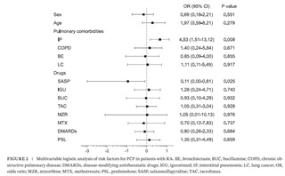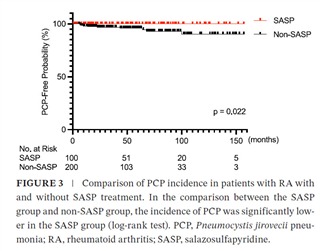 2012年1月から2025年2月までに大阪利根山医療センターで、メトトレキサート、生物学的製剤、JAK阻害剤の投与歴がある914名の関節リウマチ患者のうち、胸部CTデータのない262名と、予防的にST合剤などのPCP予防薬を投与された98名を除外した554名の患者を対象に調査されました。このうち16人がPCPを発症しました。多変量ロジスティック解析では、SASP使用はPCPリスク低下と関連していました(オッズ比:0.11、95%信頼区間:0.00–0.81)。SASPユーザーと非使用者の累積PCP発生率を比較したKaplan–Meier分析では、SASP使用がPCP発症リスクを低減することが示されました。