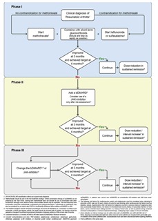 1. 関節リウマチの診断が下された時点で、DMARDsによる治療を開始しすべきです。2. 治療は、すべての患者で持続的な寛解または低疾患活動性の目標を達成することを目指すべきです。3. 活動性疾患では頻繁に(1〜3か月ごと)疾患活動度のモニタリングを行うべきです。治療開始から最大3か月以内に改善が見られない、または6か月経っても目標に到達しない場合は治療を調整すべきです。目標が維持された場合は、モニタリング頻度を減らせることがあります。4. メトトレキサート(MTX)は最初の治療戦略の一部であるべきです。MTXの禁忌がある場合や早期にMTX使用不可となった場合には、患者には、レフルノミドまたはスルファサラジン投与を検討すべきです。