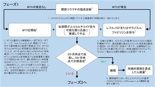 5. 短期的なグルココルチコイド投与は、csDMARDsの開始時または変更時に、グルココルチコイドの異なる用量や投与経路(経口もしくは注射)で、考慮すべきですが、臨床的に可能な限り速やかに減薬・中止されるべきです。6. csDMARD戦略で治療目標が達成されない場合は、bDMARDを追加すべきです。JAK阻害薬は検討されますが、関連するリスク要因も考慮する必要があります。
