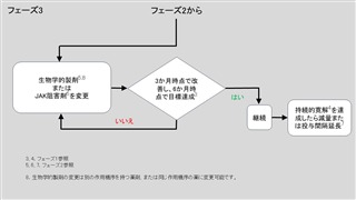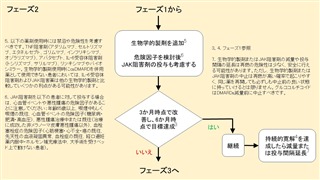 8. bDMARDまたはtsDMARDがで治療目標が達成できない場合には、別のbDMARDまたはtsDMARDによる治療を検討すべきです。1つのTNFまたはIL-6経路阻害薬治療が失敗した場合、患者は別の作用機序を持つ薬剤、または2つ目のTNF/IL-6経路R阻害薬に変更可能です。9. グルココルチコイドが中止され、患者が持続的な寛解状態にある場合は、DMARDs(bDMARDs/tsDMARDsおよび/またはcsDMARDs)の継続が推奨されますが、用量の減量も検討されることがあります。
