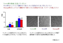 24匹のラットを無作為に3つのグループ(Control群:普通に生活しているラット、Model群はトレッドミルで運動させて筋けいれんを誘発させた後、何もしないラット、Massage群はトレッドミルで運動させて筋けいれんを誘発させた後、マッサージを施したラット)に分け実験が行われました。Model群と比較して、Massage群の疼痛の閾値が増加し、筋緊張レベル、乳酸や尿素窒素レベルが低下しました。電子顕微鏡検査により、Massage群の筋原線維はModel群よりも整然と配置されており、Massage群は明確な明暗帯を示し、ミトコンドリアが増加していることが明らかになりました。本研究では、マッサージ介入後、疼痛の閾値が増加し、骨格筋の超微細構造が改善され、マッサージ療法が筋線維を再配置し、微小循環を増加させることにより、筋肉のけいれんや痛みを軽減する可能性があることが実証されました。