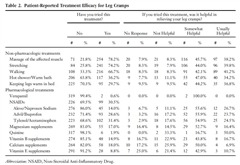 この研究は、2021年~2022年に米国中西部の州にあるプライマリケア クリニックで情報収集されました。714人の回答者のうち365人(51.1%) が足のけいれんを経験したと報告しました。下表は、脚のけいれんを経験した365人の患者から報告された脚のけいれんに対する治療とその有用性を示しています。全体として、最も頻繁に使用される治療法は非薬理学的処置でした。合計78.2%の患者が患部の筋肉をマッサージしようとし、83.9%がこれから少なくともある程度の利益が得られたと報告しました。最も一般的な薬理学的介入は鎮痛薬でした。このうち、回答者の31.4%がアセトアミノフェンの使用を報告し、30.5%がNSAIDを試しました。アセトアミノフェンは最も有用な薬理学的介入の1つでもあり、79.4%が少なくとも何らかの効果があると報告しました。