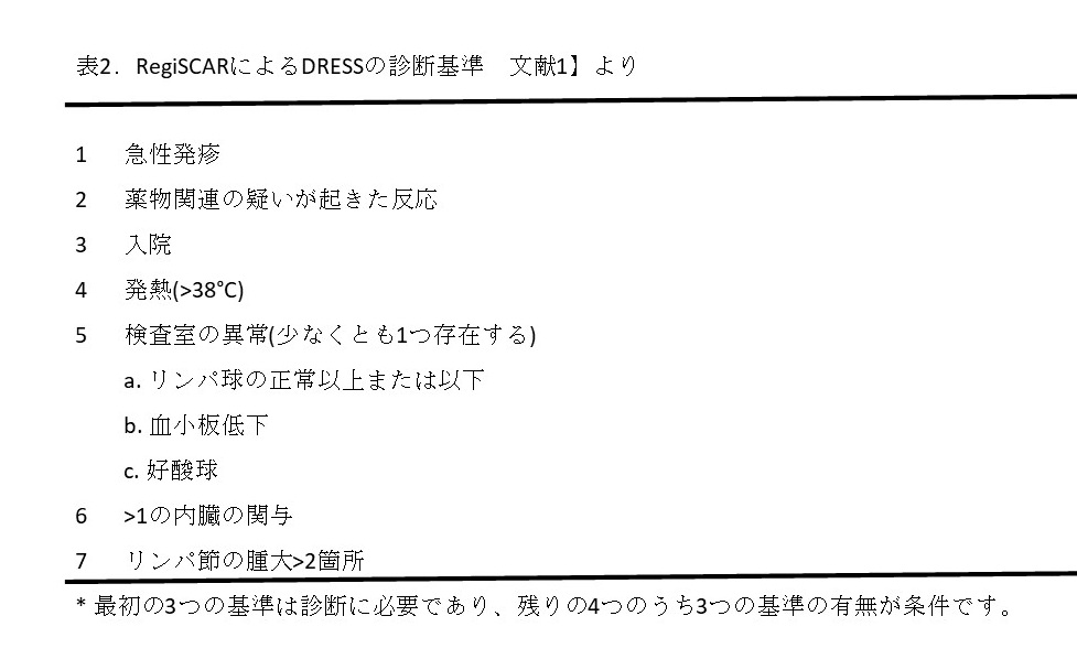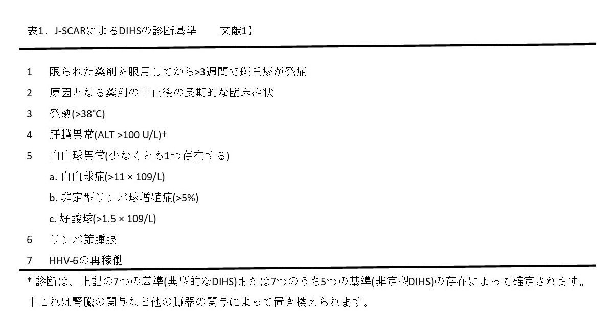 DIHSの診断基準は日本皮膚科学会(Japanese Severe Cutaneous Adverse Reaction:J-SCAR)によって、DRESSの診断基準は欧州の学会(Registry of Severe Cutaneous Adverse Reactions:RegiSCAR)によってそれぞれ発表されました。これらの基準の重要な違いは、HHV-6再活性化がDIHSに含まれている一方で、DRESSには含まれていないことです。