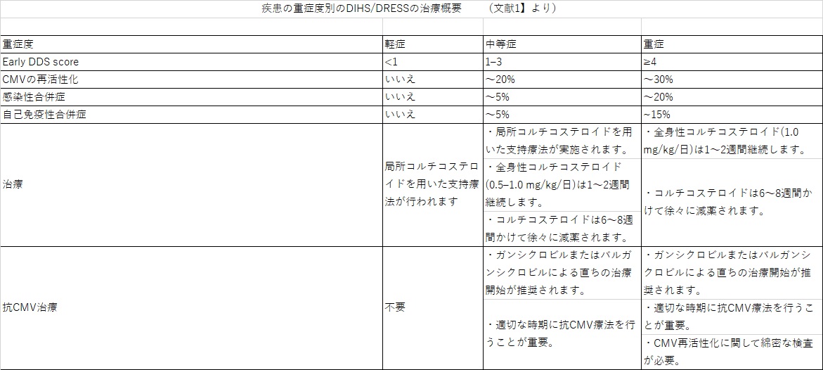 DIHS/DRESS管理の最初のステップは、早期DDSスコアを用いて疾患の重症度を評価することです。軽度の場合は局所コルチコステロイドを含む支持療法で十分です。中等症以上では、全身性コルチコステロイドは第一選択の治療法であり、疾患の重症度に応じて0.5~1 mg/kg/日投与されます。全身性コルチコステロイドの減薬は、疾患の重症度に応じて6〜8週間かけて徐々に行うべきです。一般的には1〜2週間ごとに5〜10mgずつ徐々に減量することが推奨されます。DIHS/DRESSに対するコルチコステロイドのパルス療法は議論の的であり、通常は炎症や難治性疾患を伴う重症例に用いられます。過去の研究では、パルス療法で治療された患者はしばしばCMVの再活性化が起こり、高い死亡率が報告されていました。さらに、パルス治療を受けた患者では自己免疫性合併症が多いことが明らかになりました。したがって、パルス療法は慎重に検討されるべきです。DIHS/DRESS の経過中には多剤薬剤感作を引き起こすことが多いため、発熱に対するNSAIDs、抗菌薬などの予防投与は可能な限り避けることが望ましいとされています。