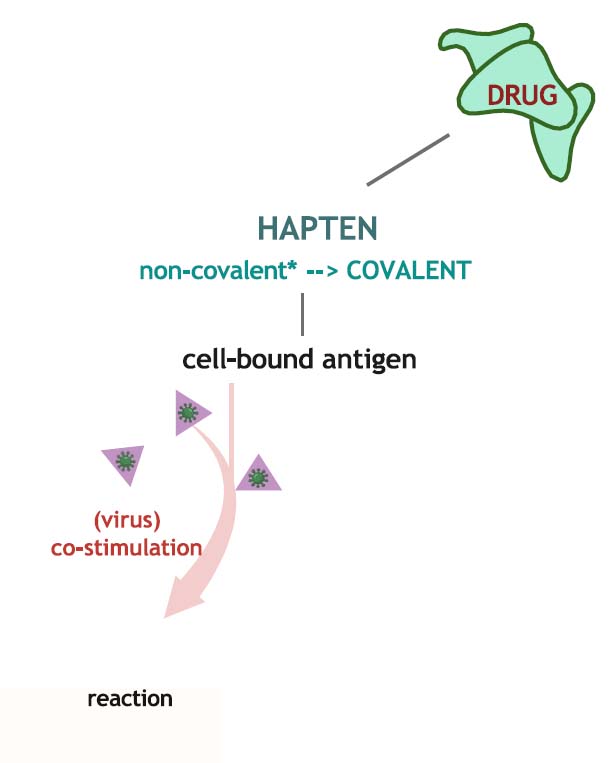 薬剤は通常抗原として直接作用するには小さすぎますが、タンパク質に結合することで特異的な免疫応答を開始します。薬物は主にタンパク質に非共有結合で結合しますが、一部の薬剤(例:ペニシリン)は、共有結合することもあります。これらの薬剤はハプテンと呼ばれ、安定したハプテン・タンパク質複合体を形成し、新たな抗原として機能し、薬剤特異的抗体やT細胞反応を引き起こすことがあります。しかし、これらの新しい抗原は、共刺激がないため免疫系では通常無視されます。ただし、薬物投与時にウイルス感染などの他の免疫活性化が起こると、ハプテン・タンパク質複合体による紅斑などの臨床症状を伴う免疫反応が起こることがあります。