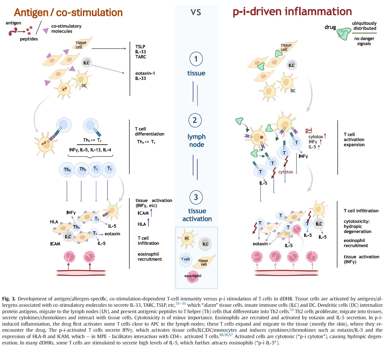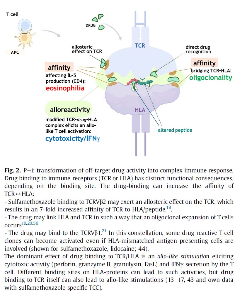 当初、遅延薬物過敏反応はハプテン・タンパク質複合体が新たな抗原として機能する抗原に誘発された免疫活性化と考えられていました。しかし、遅延薬物過敏反応患者における薬物に対する免疫応答の広範な解析により、ほとんどのT細胞活性化は別の経路から起因することが明らかになりました。薬剤が直接免疫受容体であるTCRまたはHLAに結合することが分かったのです。アバカビル、カルバマゼピン、ダプソン、バンコマイシンなどはHLAに結合し、スルファメトキサゾール、リドカインはTCRに結合することが知られています。遅延薬物過敏反応を引き起こす薬剤はTCRまたはHLAに結合することで、{TCR-ドラッグ-HLA}複合体が形成され、共刺激の存在なしに、T細胞にシグナルを発動させ、最終的に免疫活性を引き起こします。驚くべきことに、DIHS/DRESS患者には急性イベント後も何年も持続する活性化された末梢T細胞が存在します。これらT細胞は、薬物を中止してもp-i刺激により活性化され続ける可能性があります。p-i刺激は、遅発ウイルス再活性化や自己免疫の説明にもなり得ます。p-iでT細胞を刺激することで細胞増殖や強固な免疫応答が可能になります。増殖したT細胞は薬剤に(p-iを介して)反応しますが、そのTCRは特定の自己の免疫原性ペプチドと交差反応することがあり、自己免疫反応を引き起こすことがあります。DIHS/DRESS発症後数週間のウイルス血症は、一般的にウイルスの複製増加によって説明されます。あるいは、p-iで刺激された末梢T細胞が、特定のウイルス抗原(HHV-6, サイトメガロウイルス【CMV】など)に遭遇すると、細胞毒性活性が発現されます。これにより、感染組織細胞からウイルス放出され、ウイルス血症を引き起こす可能性があります。重度のDIHS/DRESSではp-i刺激により多剤高感受症(他の薬剤でも副作用発症)が生じることがあります。DIHS/DRESS患者の約25%が、化学的に異なる薬剤に対して別のDIHS/DRESSを発症します。in vitro解析は、活性化された表現型を持つT細胞が新薬への応答に関与していることを示唆しています。