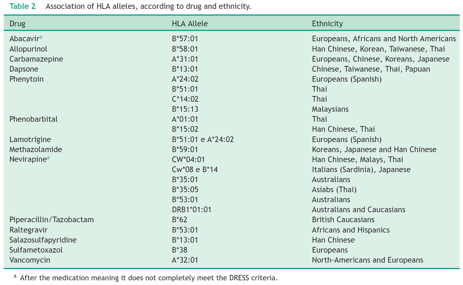 HLA対立遺伝子もDIHS/DRESS発症における最も関連性の高いリスク因子の一つです。下表のごとく、HLAのタイプが特定の薬剤と特定の民族に特異的であることが報告されています。理化学研究所のグループは2020年サラゾスルファピリジンやスルファメトキサゾール・トリメトプリムによるDIHSを含む重症薬疹患者においてHLA-A*11:01の保有率が高かったと報告しています。