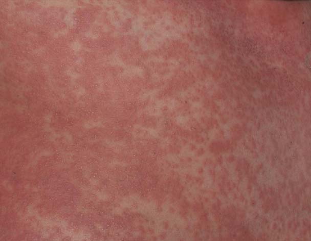 皮膚の症状は多様(斑丘疹性発疹、多形性紅斑、湿疹、紫斑、膿疱性発疹、蕁麻疹、紅皮症など)で、体表の50%以上に影響を及ぼします。発症早期には特徴的な所見に乏しく、粟粒大程度の小型の丘疹、紅斑を散在性に認めます。紅斑は眼囲を避け眼周囲の蒼白が特徴的所見として挙げられます。その後、顔面浮腫 (76%)が出現し、顔面浮腫が悪化すると、目を開けにくくなり、重症の場合は気道閉塞を引き起こすことがあります。痒みはよく見られ、焼けるような痛みが出ることもあります。体幹や四肢の紅斑が拡大すると紫斑も出現します。下肢の紫斑の範囲は疾患の重症度と相関しています。DIHS/DRESSにおける膿疱性発疹は通常、耳、鼻、顎の周辺に見られます。