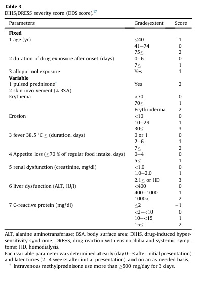 DIHS/DRESS重症度スコア(DDS)スコアは、疾患の重症度を評価し、特に感染症および自己免疫合併症を予測するために開発されました。このスコアリングシステムは、CMVの再活性化や感染合併症のリスクがある個人を特定するのに有用です。臨床症状と検査結果に基づき、DIHS/DRESSの患者は軽度(スコア<1)、中等度(スコア1–3)、重度(スコア≥4)の3つのカテゴリーに分類されます。早期スコアリングは通常、初回症状発生から3日以内に実施され(early score)、フォローアップスコアは2〜4週間後に評価されます(late score)。DIHS/DRESSの重症度の階層化は適切な治療を決定する上で不可欠です。