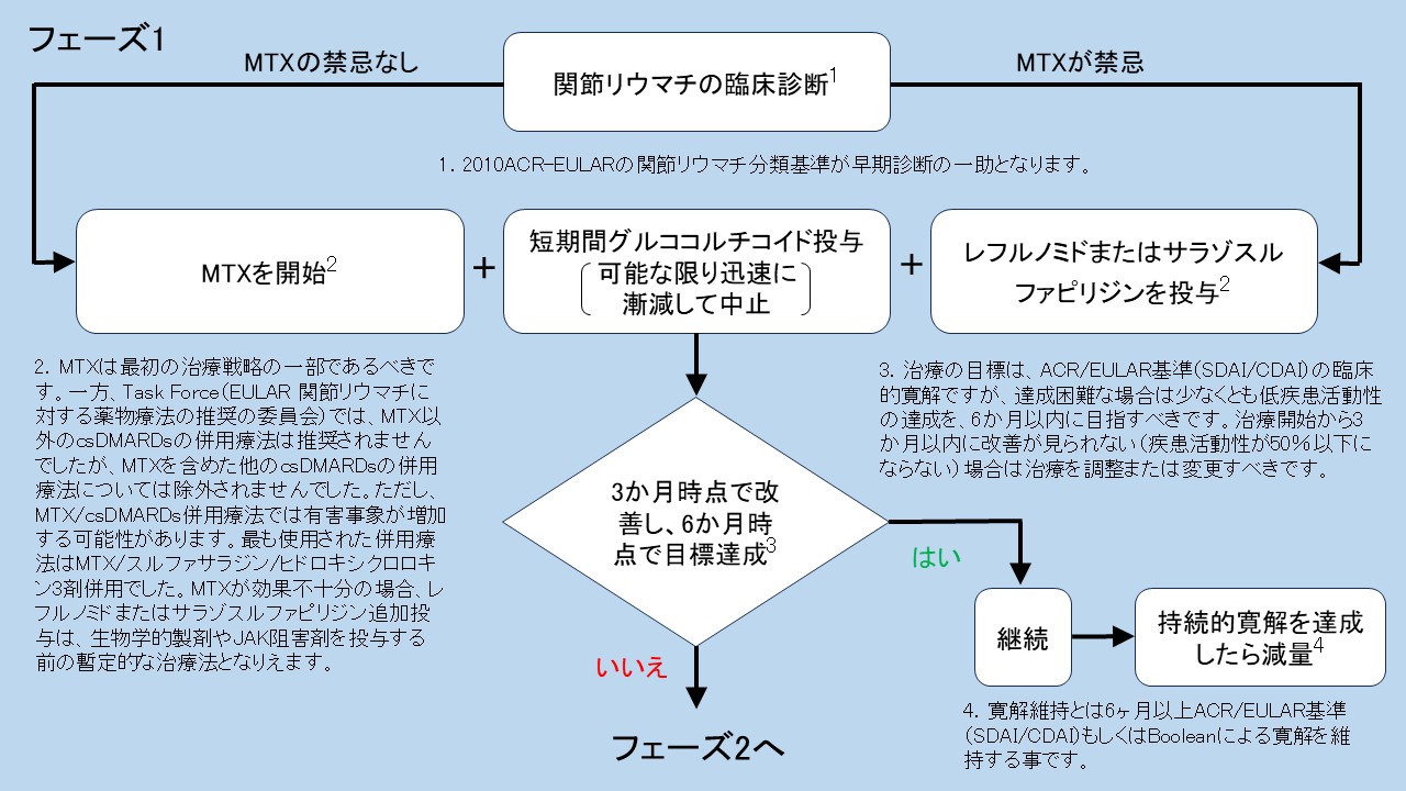 4. メトトレキサート(MTX)は最初の治療戦略の一部であるべきです。MTXの禁忌がある場合や早期にMTX使用不可となった場合には、患者には、レフルノミドまたはスルファサラジン投与を検討すべきです。