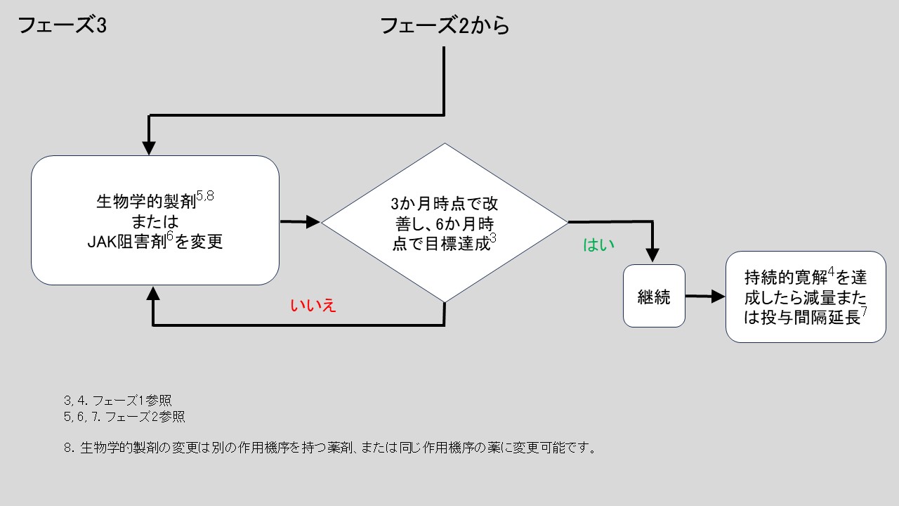 8. bDMARDまたはtsDMARDがで治療目標が達成できない場合には、別のbDMARDまたはtsDMARDによる治療を検討すべきです。1つのTNFまたはIL-6経路阻害薬治療が失敗した場合、患者は別の作用機序を持つ薬剤、または2つ目のTNF/IL-6経路R阻害薬に変更可能です。
