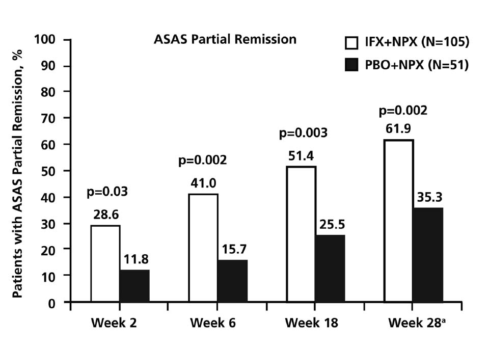 この図はナプロキサン(NSAIDS)単独とインフリキシマブ、ナプロキサン併用療法の効果を示した図です。部分寛解(partial remission)とは、患者全般評価、背部痛、身体機能、背中のこわばりが0-10までの点数ですべて2以下になる状態をいいます。当然のことながら、インフリキシマブ、ナプロキサン併用療法の方が、部分寛解にいたる確率が高いのですが、驚くべきことは、ナプロキサン単独でも有効で、28週後に35.3%も部分寛解に至っているということです。