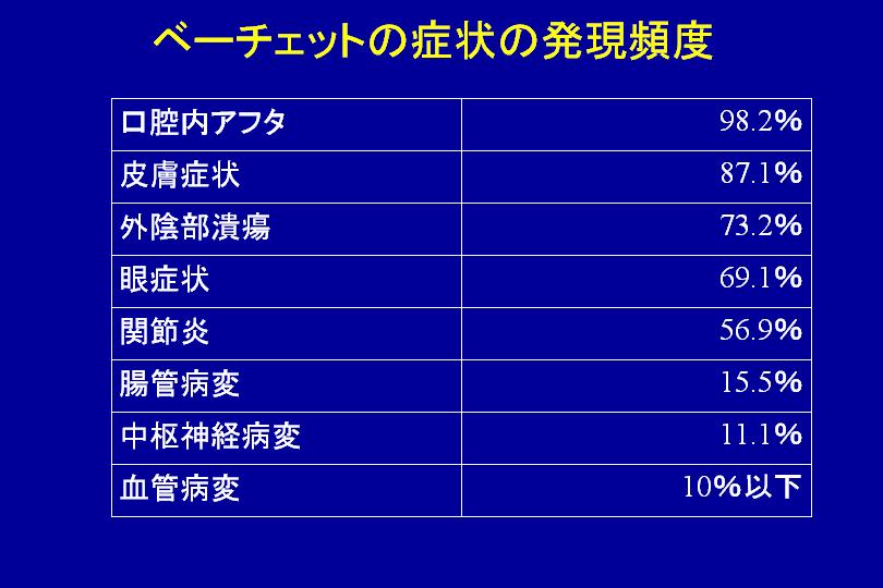 口腔粘膜のアフタ性潰瘍(口腔性アフタ) 口腔粘膜の再発性アフタ性潰瘍は、ベーチェット病にほぼ必発であり、初発症状として多くみられます。境界のはっきりした底面に黄白色の苔状の壊死組織を付着する円形ないし楕円形の有痛性の小潰瘍で、周囲に赤みを伴っています。口唇、歯肉、頬粘膜、舌などに多く見られます。個々...