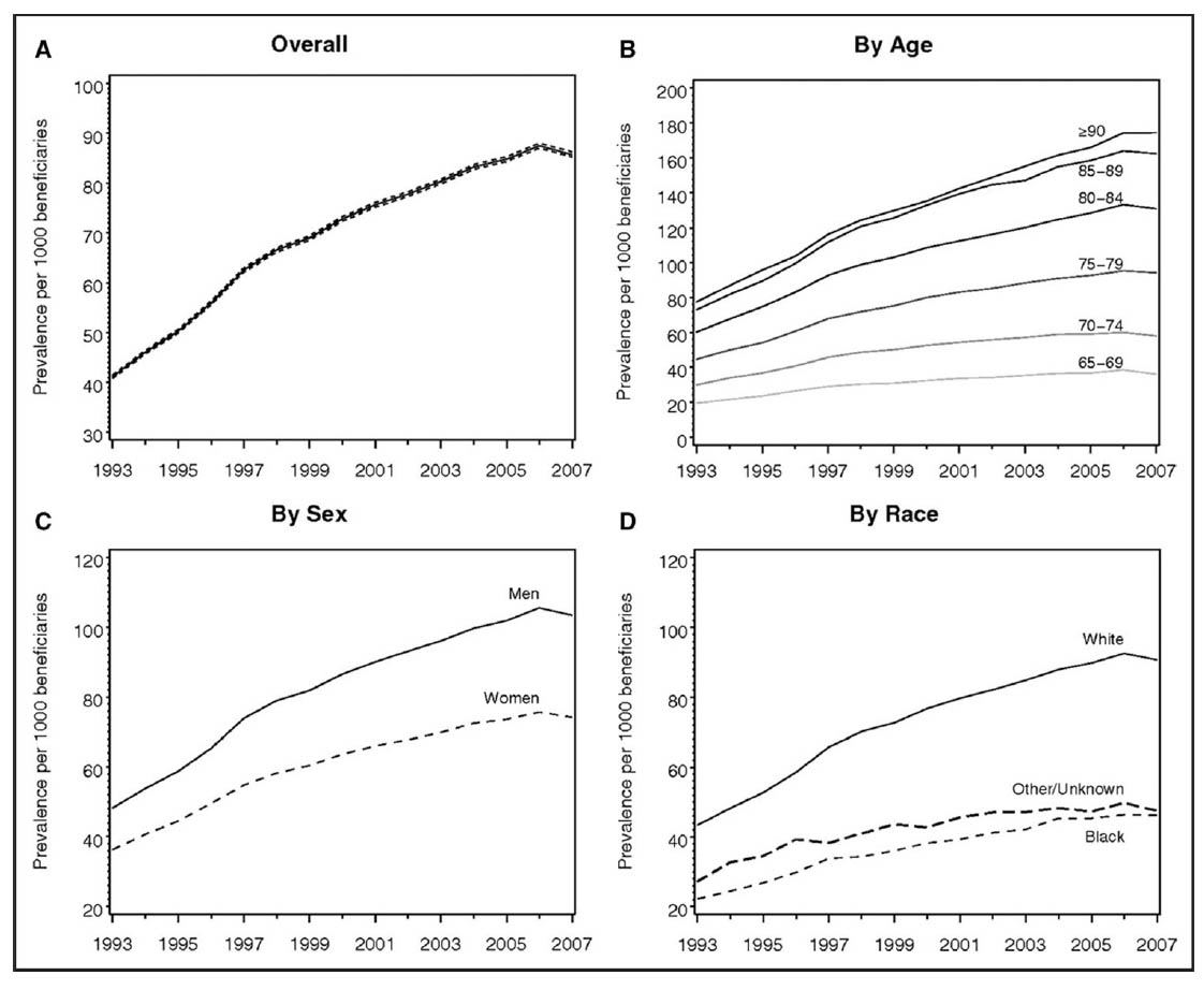1993年から2007年における米国のメディケア受給者における心房細動の有病率。