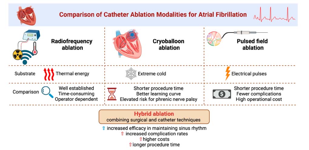 カテーテルアブレーションは、複数の二重盲検試験と大規模なレジストリからの証拠により、心房細動の確立された治療法となり、新しい技術が開発されるにつれて進化し続けています。最近の情報によると、心房細動のアブレーションは、持続性心房細動と発作性心房細動の両方に対して抗不整脈薬よりも効果的であることが示されています。現在、高周波、クライオバルーン、レーザーバルーン、ホットバルーン、パルスフィールド、ハイブリッドアブレーションなど、いくつかのアブレーション方法が存在します。高周波アブレーションは、確立された効果的で安全な技術であり、熱エネルギーを使用して心臓組織をアブレーションします。温度制御された高周波エネルギーに最適化された接触力感知カテーテルの最近の導入により、その性能はさらに向上しましたが、多くの場合、より多くの手順が必要になります。対照的に、極低温を使用するクライオバルーンアブレーションは、手技の時間を短縮しながら、ラジオ波アブレーションに匹敵する結果を提供しますが、横隔神経麻痺のリスクが高くなります。パルスフィールド アブレーションは、電気パルスを使用して心臓組織を選択的に標的とする新しい技術であり、クライオバルーンアブレーションと比較して、処置時間が短く、合併症が少ないため、有望な有効性と安全性の結果を示していますが、その機器の高コストが障壁になる可能性があります。低侵襲手術とカテーテルベースの技術の両方を統合したハイブリッドアブレーションは、カテーテルアブレーションのみと比較して、洞調律の維持に優れた有効性を示しています。しかし、このアプローチは、合併症の発生率が高く、コストが高く、処置時間が長くなることが知られています。肺静脈隔離術は、現在、心房細動のカテーテルアブレーションにおける主要なアプローチです。610人の患者を対象とした6つの無作為化臨床試験からなるメタアナリシスで、1年間の追跡期間中に肺静脈隔離術を受けた患者の心房細動の再発は、他のアブレーション戦略と比較して有意に低かったことがわかりました。