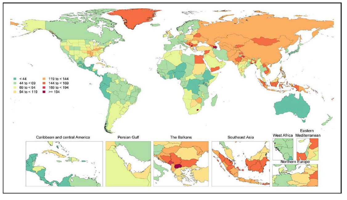 2020年世界各国の100,000人あたりの心房細動および心房粗動の年齢標準化された有病率。文献1】より