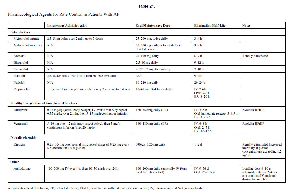 | 3.重度の左室肥大、HFrEF、または冠動脈疾患を有する患者における心房細動に対する除細動が望ましい場合、除細動の遅延が生じる可能性があることを承知の上で、アミオダロンの静脈内投与が推奨されます。 | I | A |