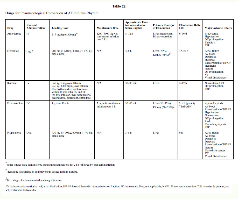 薬理学的除細動は、血行動態的に安定している新規発症または持続性の心房細動の患者で、電気的除細動が望ましいが禁忌の場合に適応されます。イブチリド(日本未承認)は、心房細動の薬理学的除細動に迅速に機能しますが、特にHFrEF(収縮機能が低下した心不全)患者では、QT間隔の延長とトルサードドポワントに関連しています。アミオダロンの静脈内投与は、イブチリドよりも心房細動変換に長い時間を必要とします。静脈内プロカインアミドは、心房細動の薬理学的変換に対してプラセボよりも効果的ですが、イブチリドよりも効果が低くなります。ドフェチリド(日本未承認)、経口アミオダロン、および経口ソタロールは、心房細動から洞調律への変換に効果的であることが示されていますが、有効性には数日かかるため、急性薬理学的除細動の実用的な選択肢ではありません。フレカイニドとプロパフェノンは、心房細動から洞調律への変換に効果的ですが、不整脈のリスクがあるため、構造的心疾患または心不全には禁忌です。