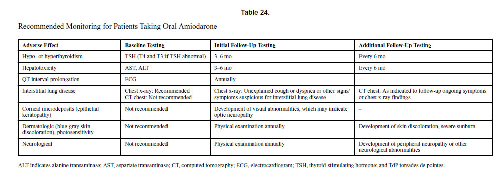 経口アミオダロンを服用している患者では以下のモニタリングが推奨されています。アミオダロンには重量で37%のヨウ素が含まれているため、患者の2%から24%で甲状腺の異常が生じる可能性があります。ある研究では、アミオダロン誘発性甲状腺機能低下症の発症までの期間の中央値は183日で、甲状腺機能亢進症の発症の中央値は720日でした。定期的な甲状腺機能チェックが必要です。経口アミオダロンは、肝臓トランスアミナーゼの上昇を引き起こし、まれに肝毒性を引き起こす可能性もあります。アミオダロンは、間質性肺疾患または過敏症症候群の形で肺毒性を引き起こす可能性があり、頻度は内服者の1%から2%で、症例の約10%で致命的となります。したがって、定期的な胸部X線検査が、推奨されます。アミオダロンの服用中に原因不明の咳嗽や呼吸困難を発症した患者では、胸部CTスキャンが診断に役立ちます。角膜微小沈着物(上皮性角膜症)はアミオダロン投与後に見られますが、視覚異常や光過敏症はまれです。したがって、眼科検査は、視覚異常が発症した場合にのみ合理的です。アミオダロンはまた、末梢神経障害に関連しています。経口アミオダロンはトルサード・ド・ポワントを引き起こす可能性があります。