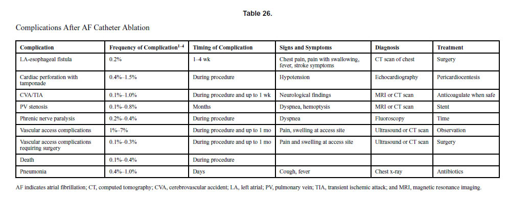 心房細動カテーテルアブレーションの合併症は、患者の約5%で発生し、そのほとんどが血管合併症です。ただし、生命を脅かすいくつかの合併症が発生する可能性があります。最も重篤な合併症は左心房から食道への穿孔であり、これはしばしば致命的ですが、非常にまれです。別の生命を脅かす合併症は心膜タンポナーデですが、これは通常、迅速な心膜穿刺で治療できます。臨床的に重要な脳卒中とTIAは、患者の<1%で観察されます。アブレーション中の死亡は通常、タンポナーデによるものですが、脳卒中でも発生する可能性があります。