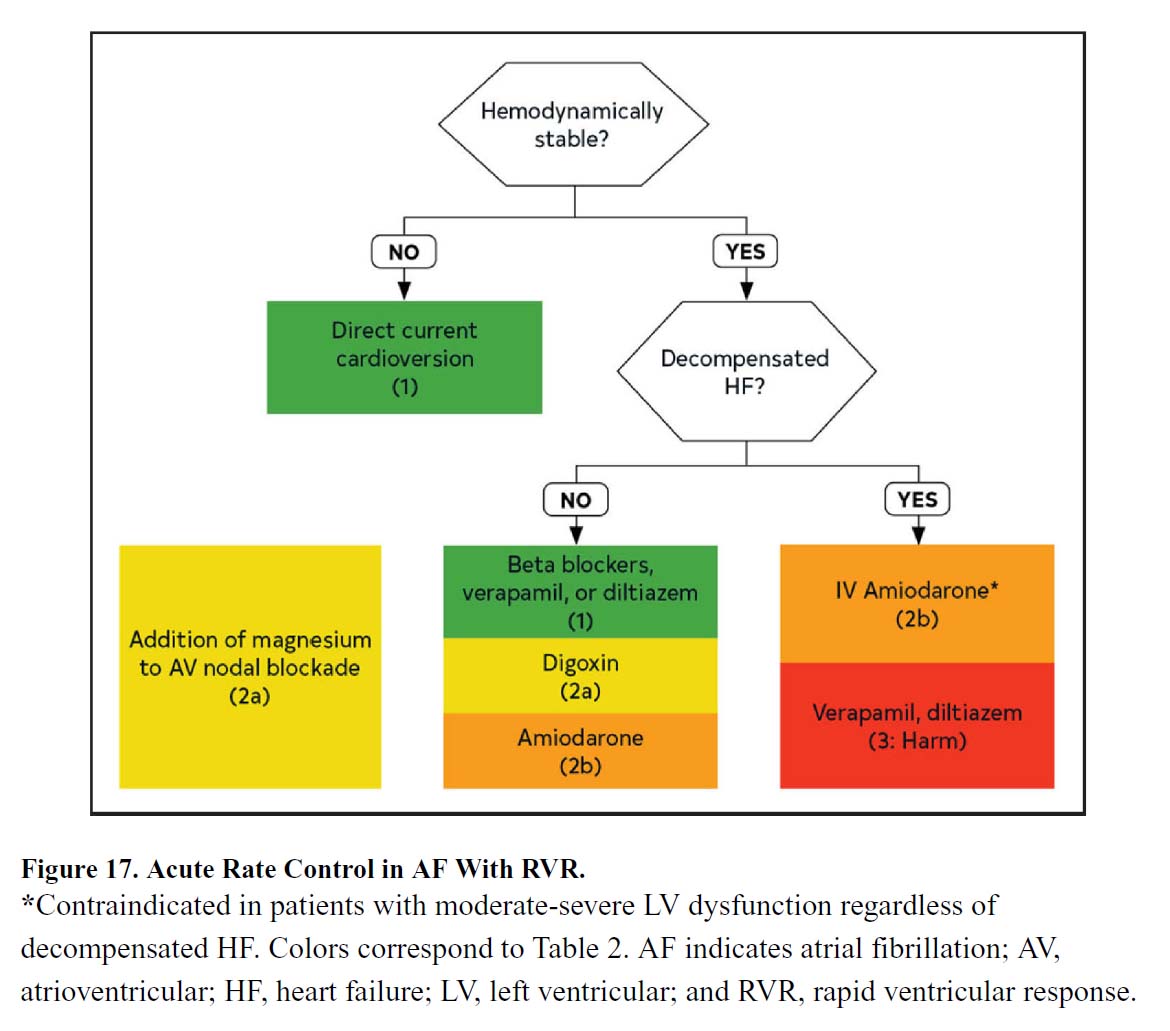 | 2.最近発症した心房細動に対する薬理学的除細動が望ましい場合、ベルナカラントの静脈内投与が推奨されます。ただし、最近発症した急性冠症候群、HFrEF、または重度の大動脈弁狭窄を有する患者は除きます。 | I | A |