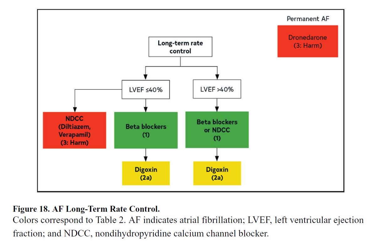 | 2.ドロネダロンは、HFmrEF(収縮機能が中等度の心不全、40%≦ LVEF <%50%)、HFpEF(収縮機能が保たれた心不全、LVEF ≧40%)、虚血性心疾患、または弁膜疾患を有する患者を含む、長期のリズムコントロールを必要とする心房細動患者において、心房細動の再発および進行を予防するために推奨されます。 | I | A |