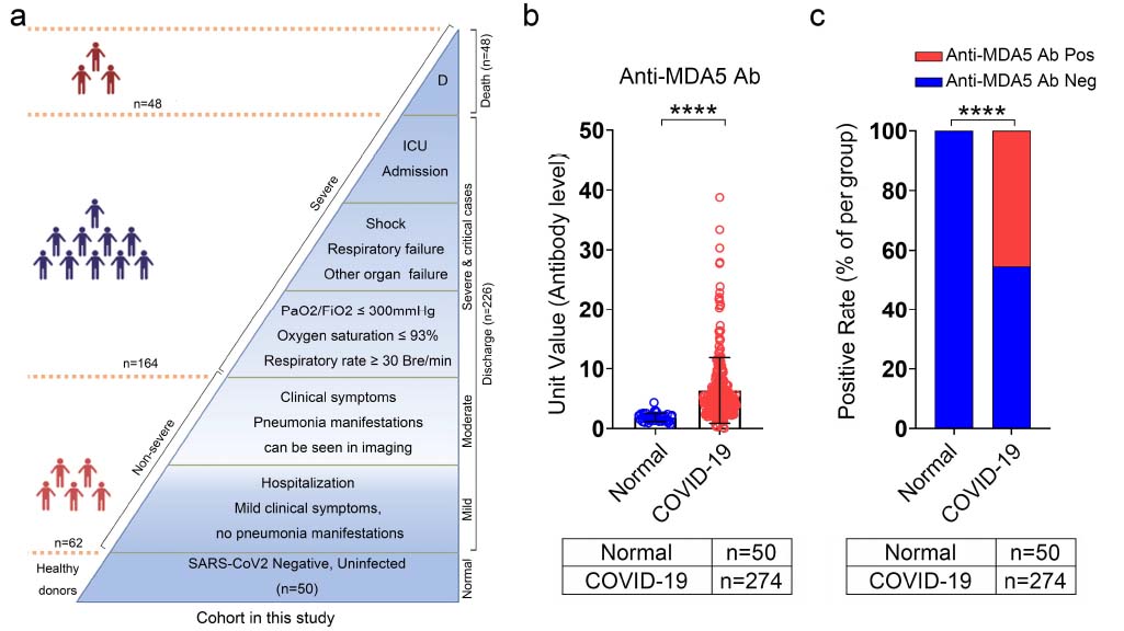 武漢、ハルピン、北京の病院に入院した274名のCOVID19感染症患者の抗MDA5 抗体の抗体価は正常者に比べ高く(b)、COVID19感染症患者の48.2%で抗MDA5 抗体陽性という結果が認められました(c)。