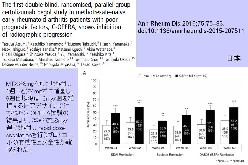 ちなみに、C-OPERA試験では8mg/週で経口投与を開始し、4週ごとに4mg増量し、治療開始8週後には最大用量の16mg/週まで増量するプロトコールが用いられました。