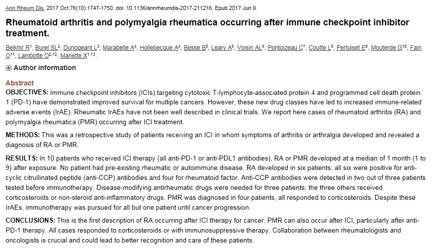 最近注目の癌に対する免疫療法(免疫チェックポイント阻害療法:抗PD-1抗体 ニボルマブなど)後に、関節リウマチやリウマチ性多発筋痛症を発症した症例が報告されています。