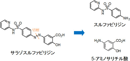 SASPは5-アミノサリチル酸(メサラミンまたはメサラジン:サリチル酸;鎮痛剤)とスルファピリジン(サルファ剤;抗菌剤)をアゾ結合で結合したプロドラッグです。大腸内の細菌はアゾ結合を切断し、5-アミノサリチル酸という有効成分を解放します。アザルフィジンENなどの腸溶錠は大腸で薬が溶解するように設計されています、これはSASPに伴う消化器系の副作用を軽減する目的もあります。生物学的製剤等に比べ安価で、他の疾患修飾性抗リウマチ薬と比べて催奇形性がほとんどありません。