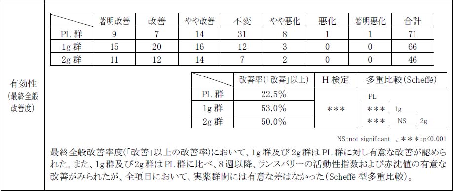 関節リウマチ患者(299例)を対象に、二重盲検群間比較法によりプラセボ、サラゾスルファビリジン腸溶錠1日1g(1g群)、または1日2g(2g群)を、16週間、食後連続経口投与し、本剤の至適用量を検討した結果、サラゾスルファビリジン腸溶錠はプラセボに比べ、有意に高い有効性が認められ、安全性の点を勘案すると至適用量は1日1gであることが明らかとなりました。