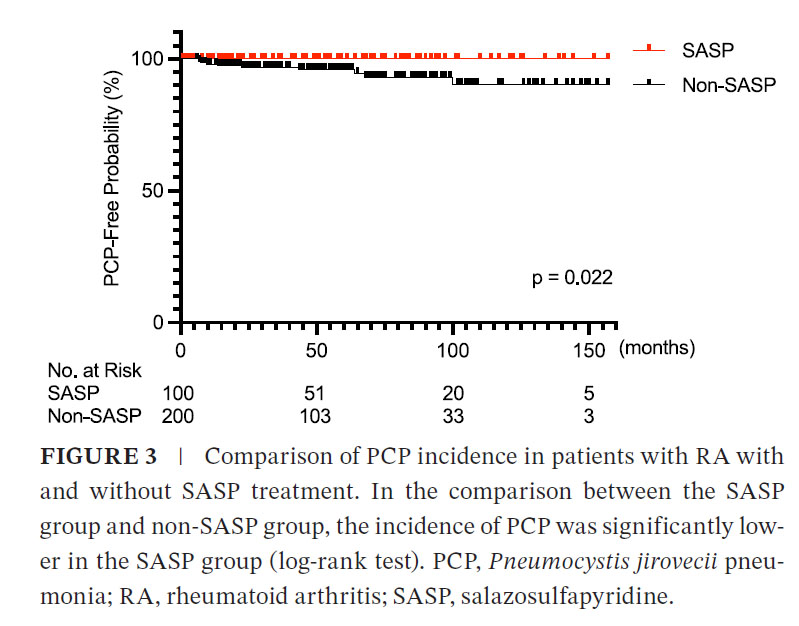2012年1月から2025年2月までに大阪利根山医療センターで、メトトレキサート、生物学的製剤、JAK阻害剤の投与歴がある914名の関節リウマチ患者のうち、胸部CTデータのない262名と、予防的にST合剤などのPCP予防薬を投与された98名を除外した554名の患者を対象に調査されました。このうち16人がPCPを発症しました。多変量ロジスティック解析では、SASP使用はPCPリスク低下と関連していました(オッズ比:0.11、95%信頼区間:0.00–0.81)。SASPユーザーと非使用者の累積PCP発生率を比較したKaplan–Meier分析では、SASP使用がPCP発症リスクを低減することが示されました。