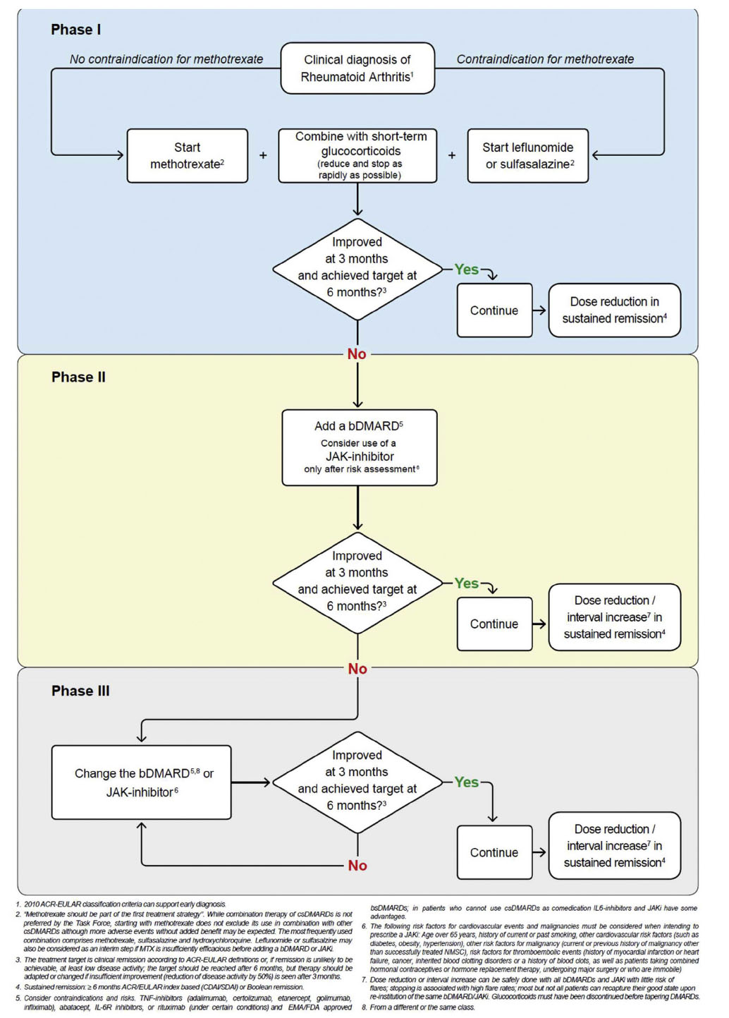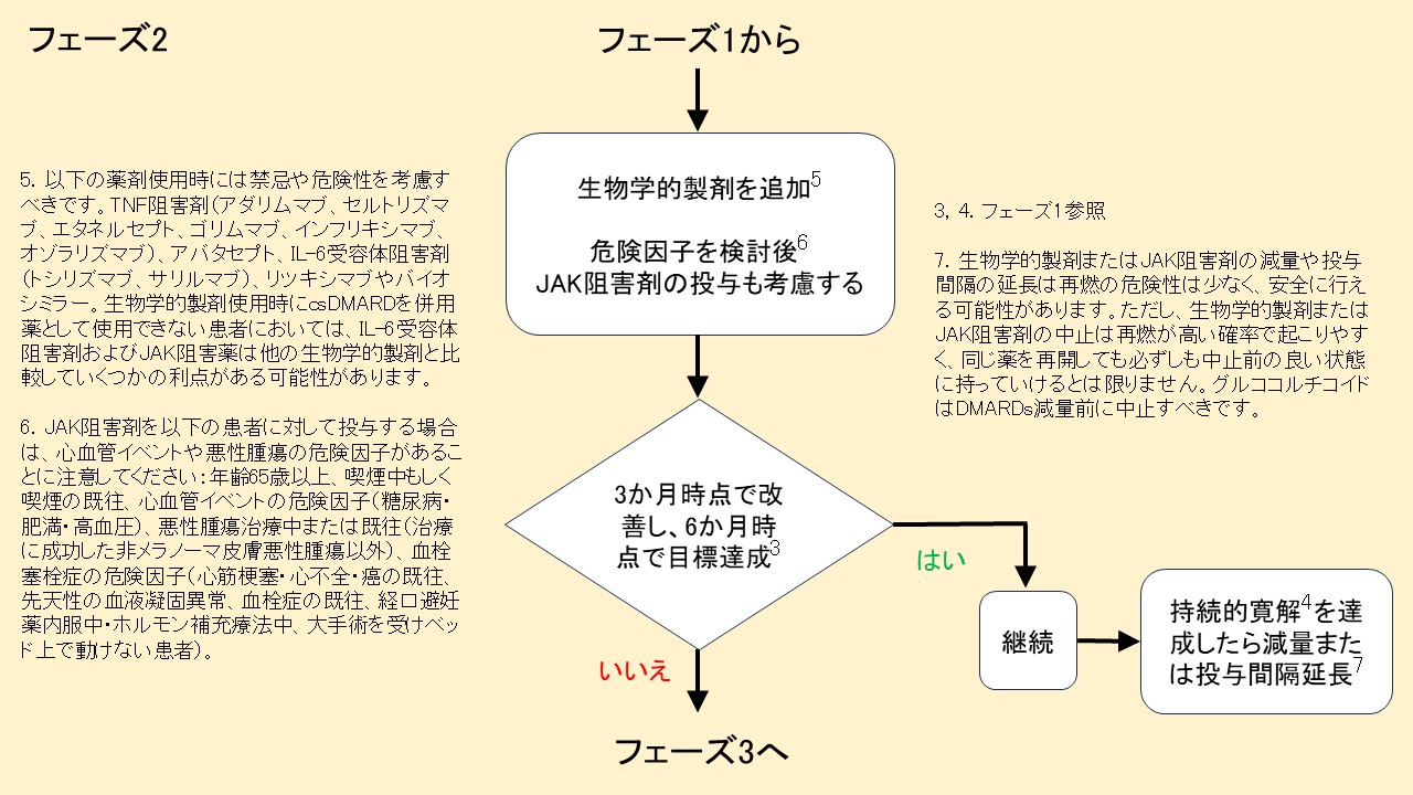 6. csDMARD戦略で治療目標が達成されない場合は、bDMARDを追加すべきです。JAK阻害薬は検討されますが、関連するリスク要因も考慮する必要があります。