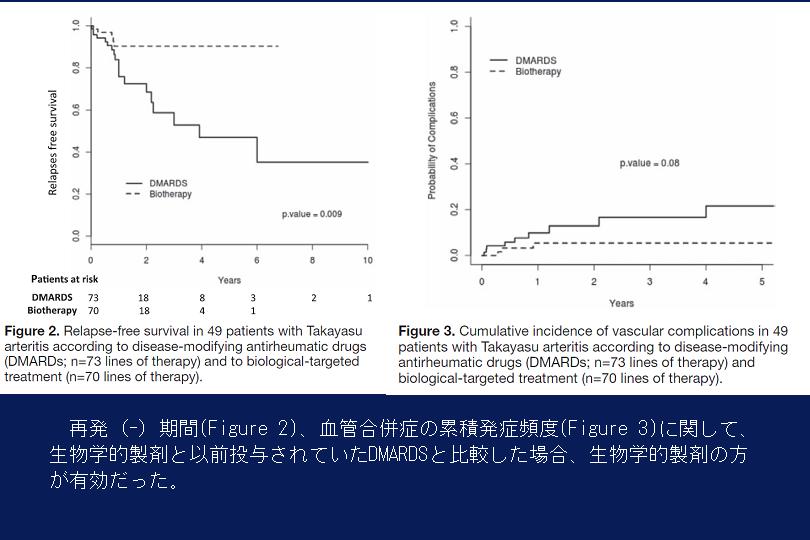 <解説> 委員会はトシリズマブよりもTNF阻害薬を支持した。これは、高安動脈炎におけるTNF阻害薬の臨床経験とデータがトシリズマブよりも多いためである。観察研究では、TNF阻害薬が寛解を誘導し、再発を減少させることが示されている。 高安動脈炎におけるトシリズマブの臨床経験は、無作為化対照試験および小規模な症例報告で実証されている。無作為化試験では、トシリズマブ群で再発までの時間が長くなる傾向が見られたが、その差は統計的に有意ではなかった。しかも、その研究は症例数が少なかった (36名の症例)。注目すべきことに、トシリズマブの使用は急性期炎症反応(血沈、CRP)にも影響を与え、疾患活動性を測定する際に影響を与える可能性がある。したがって、委員会はTNF阻害薬の使用を支持しているが、特にTNF阻害薬が禁忌である場合は、トシリズマブも考慮できることを認識している。